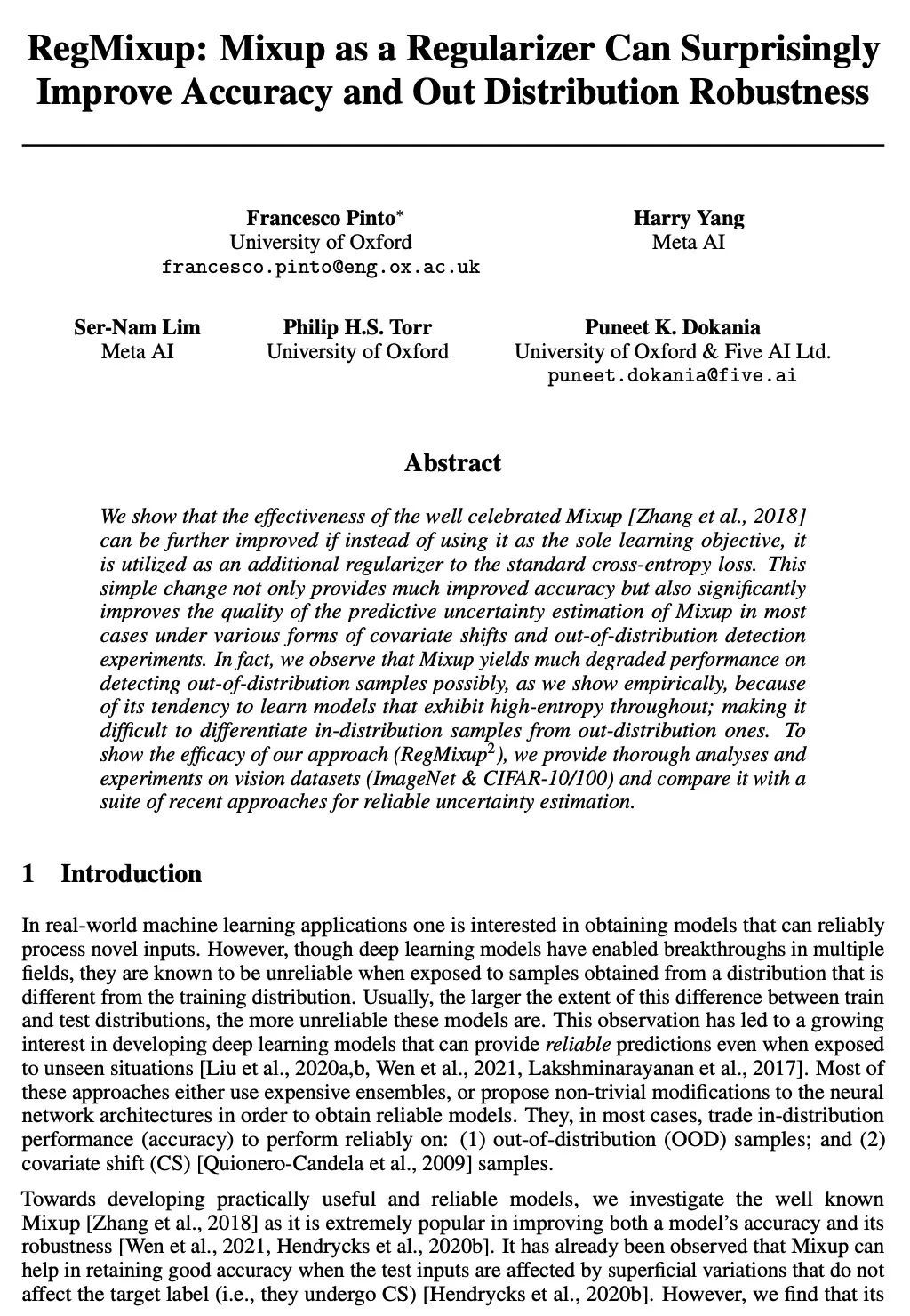 1、[LG] RegMixup: Mixup as a Regularizer Can Surprisingly Improve Accuracy and Out Distribution Robustness