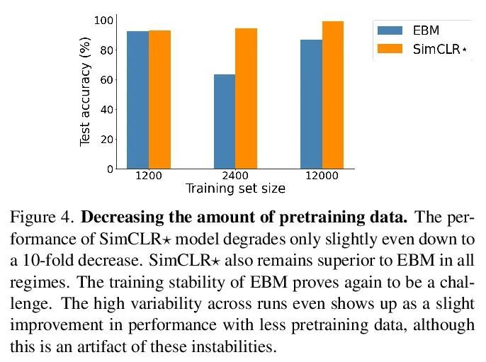 EBMs vs. CL:视觉问答自监督视觉预训练探索。干净和多样标记数据的可用性,是训练复杂任务模型的主要障碍,如视觉问答(VQA)。在大型视觉和语言模型方面的大量工作表明,自监督学习对于预训练多模态交互是有效的。本文专注于视觉表示,回顾并评估了自监督方法,以利用未标记图像预训练一个模型,在一个自定义的VQA任务上对其进行微调,该任务允许可控的评估和诊断。本文比较了基于能量的模型(EBM)和对比学习(CL)。虽然EBM越来越受欢迎,但它们缺乏对下游任务的评估。研究结果表明,EBM和CL都可以从未标记图像中学习表示,从而在很少的标注数据上训练一个VQA模型。在一个类似于CLEVR的简单设置中,CL表示也改善了系统泛化,甚至与来自一个更大的、有监督的、经过ImageNet训练的模型的表示的性能相匹配。然而,EBM由于其结果的不稳定性和高变异性而难以训练。因此,本文调研了EBM的其他声称的好处。它们被证明对OOD检测很有用,但其他基于能量的监督训练和不确定性校准的结果基本上是负面的。本文提出了一个令人鼓舞的观点,即自监督视觉预训练允许将对训练数据的一些要求从主/监督阶段转移到预训练/无监督阶段。CL目前似乎是比EBM更好的选择。令我们惊讶的是,EBM无法实现文献中所宣称的好处,即使是在简单环境中。