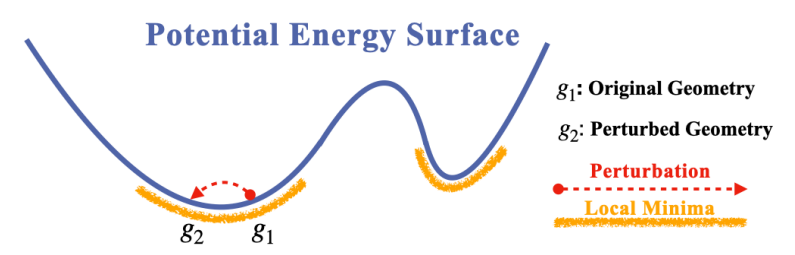 上图展示了关于分子的坐标几何。分子处于连续运动中,形成一个势能表面(PES,Potential Energy Surface),其中每个三维坐标(x轴)对应一个能量值(y轴)。所提供的分子,即构象体,处于局部最小值(g1)。它往往伴随着最小值周围的噪音(如统计和系统误差或振动),这可以用扰动的几何体(g2)来捕获。