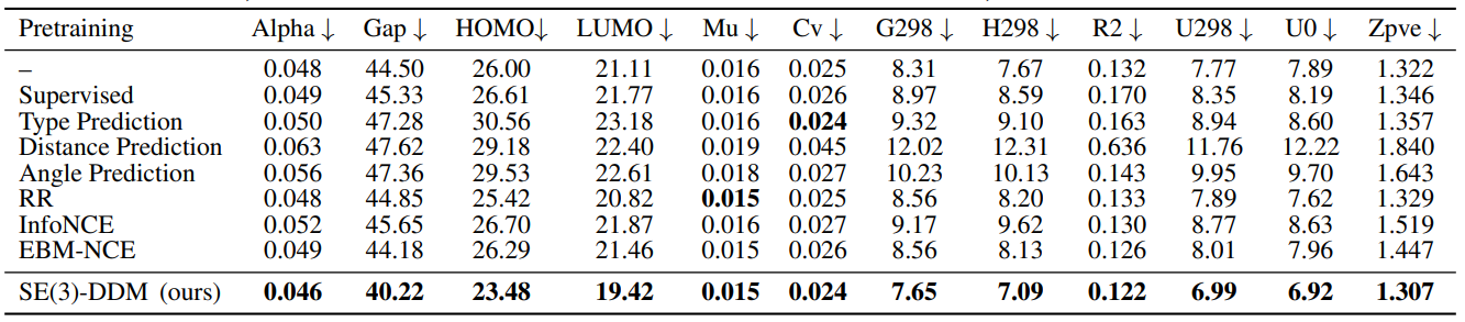 上表显示了QM9的结果。可以看到,大多数被测试的预训练基线的表现与随机初始化基线(-)相当,甚至比它更差。表现最好的基线是表示重建方法(RR),它优化了坐标感知的MI;它在QM9的12个任务中的5个任务和MD17的8个任务中的6个任务中表现优于其他基线。这意味着应用生成性SSL来最大化这个坐标感知的MI是有潜力的。本文提出的SE(3)-DDM在QM9和MD17的所有20个任务上都取得了持续改进的性能。所有这些观察都从经验上验证了距离去噪的有效性,它模拟了分子几何数据中最有决定性的因素。