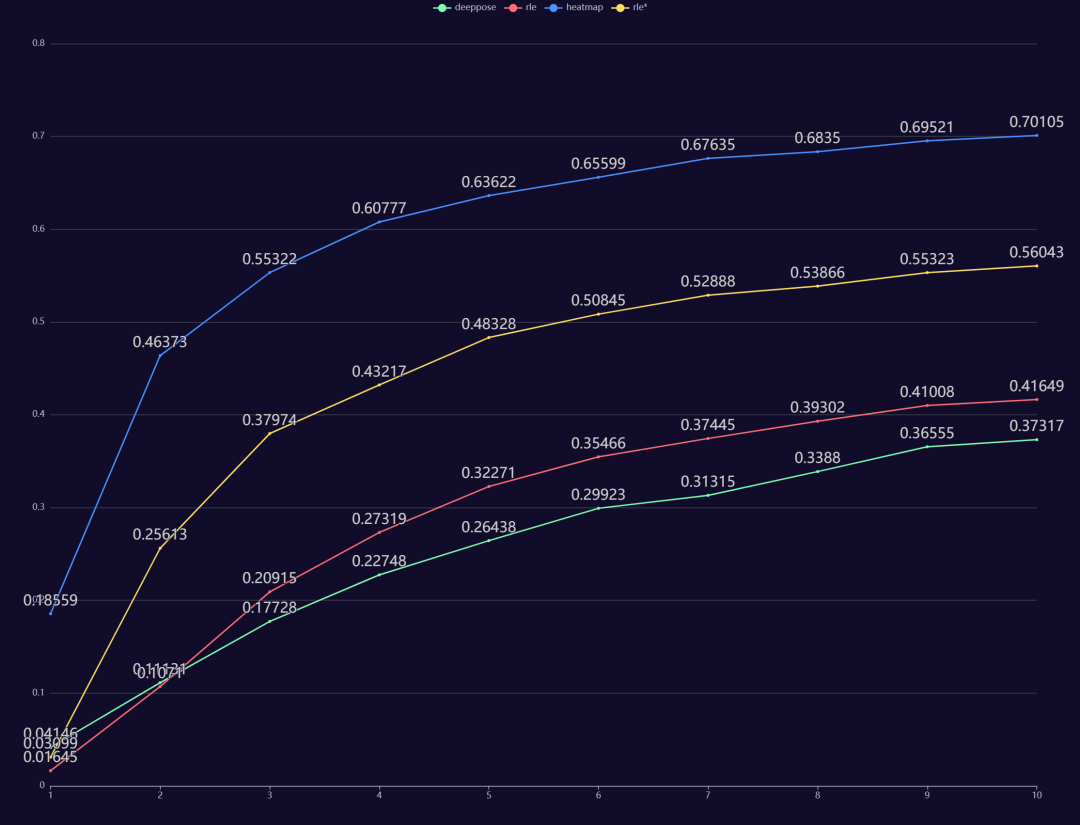 可以看到过拟合现象被进一步缓解,在接近5ms的速度提升的同时精度几乎没有降低,至此,我们以12.3ms的推理速度让基于regression方法的模型,达到了超越heatmap方法的精度,且推理速度快了近3倍。