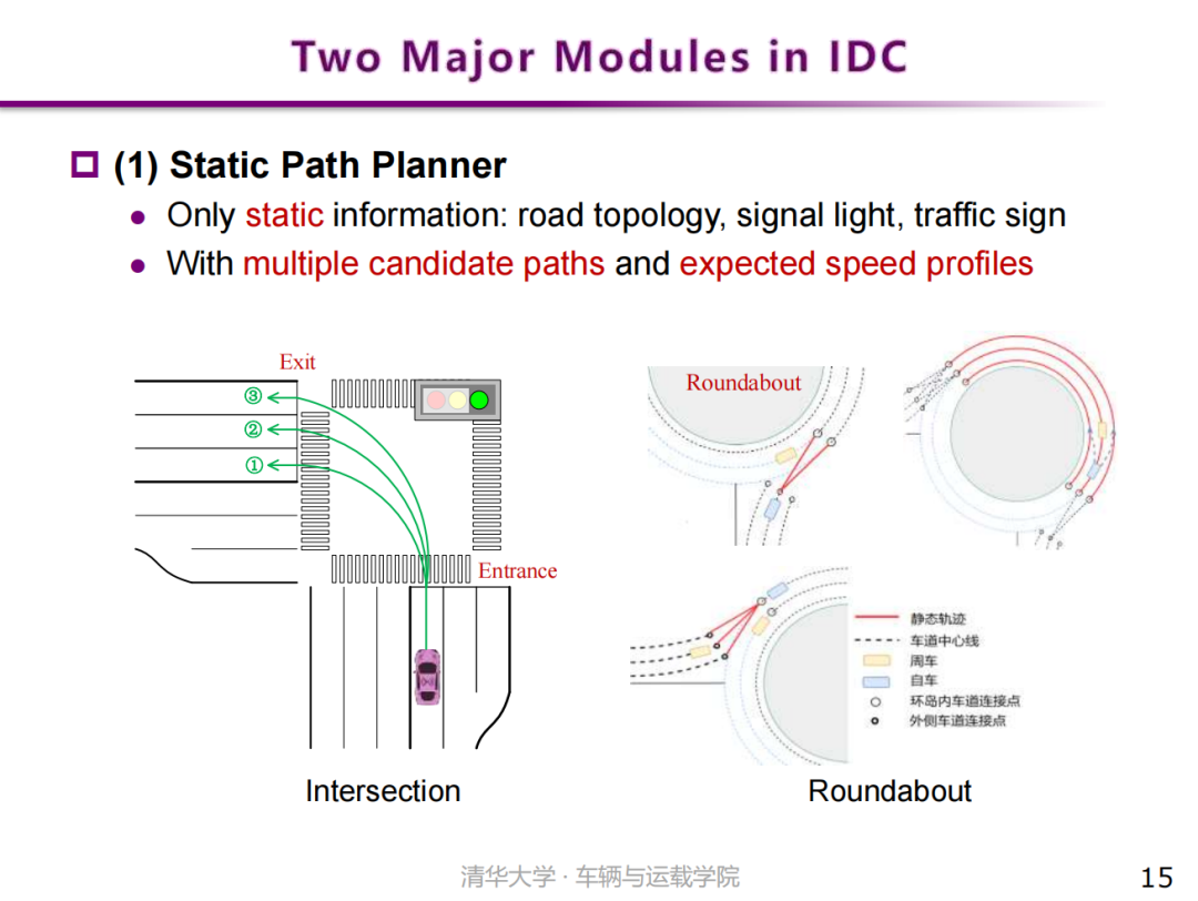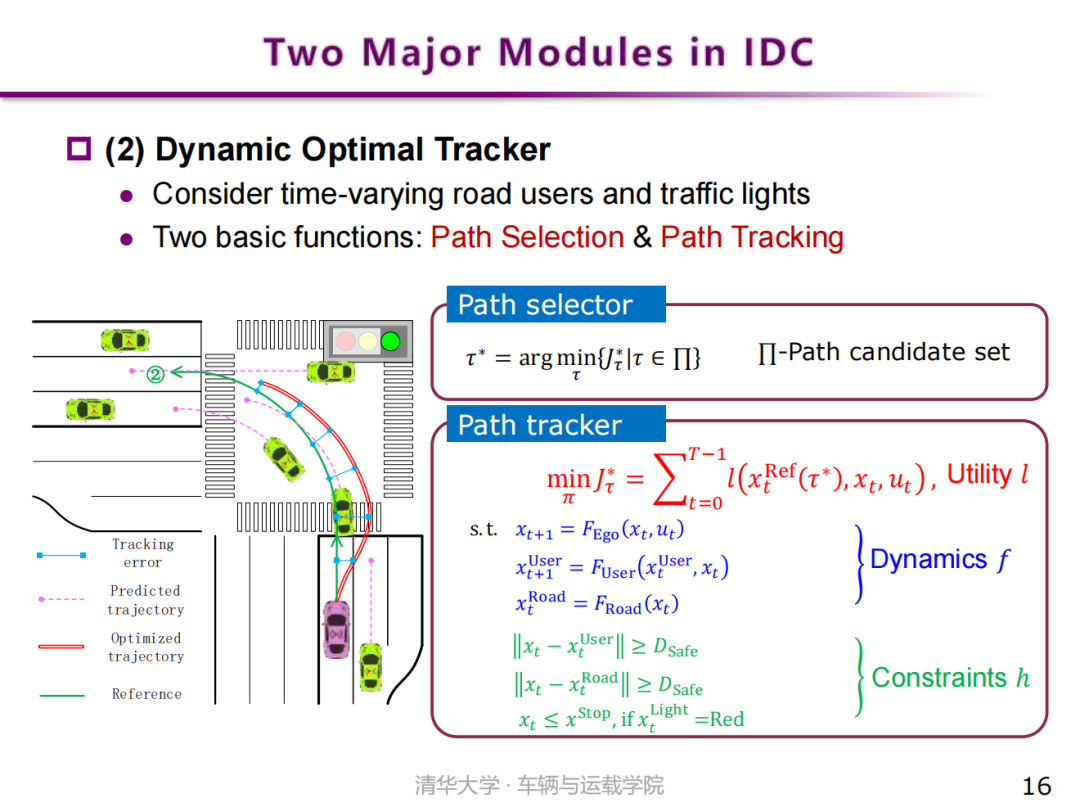 同时,车辆在运动过程中,动态优选跟踪模块根据周车和交通信号的具体变化输出相应的控制量,以满足上述不同驾驶需求,在整体行驶路线尽可能地跟踪挑选的参考路径的基础上,实现实时避撞等合理驾驶行为。IDC与分层式决控架构的区别在于,虽然IDC仍存在静态层与动态层两个模块,但决策智能的核心部分仍依赖动态部分的约束型最优跟踪问题的构建与求解。静态层的主要作用是通过全局的、大致的静态路径提供较强的先验知识,降低约束问题的求解难度。