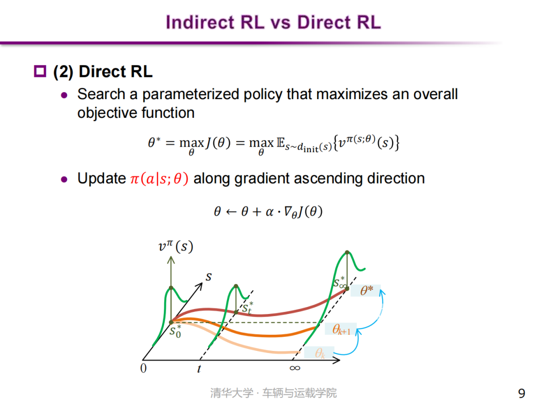 与之不同的是,直接式强化学习(Direct RL)则直接寻找最大化目标函数的参数化策略作为其最优策略。该方法将最优控制问题视作一个优化问题,采用数值优化方法进行求解。典型方法是一阶优化方法,即策略梯度法,它沿着目标函数上升的梯度方向,不断地更新策略参数,直到找到最优解。