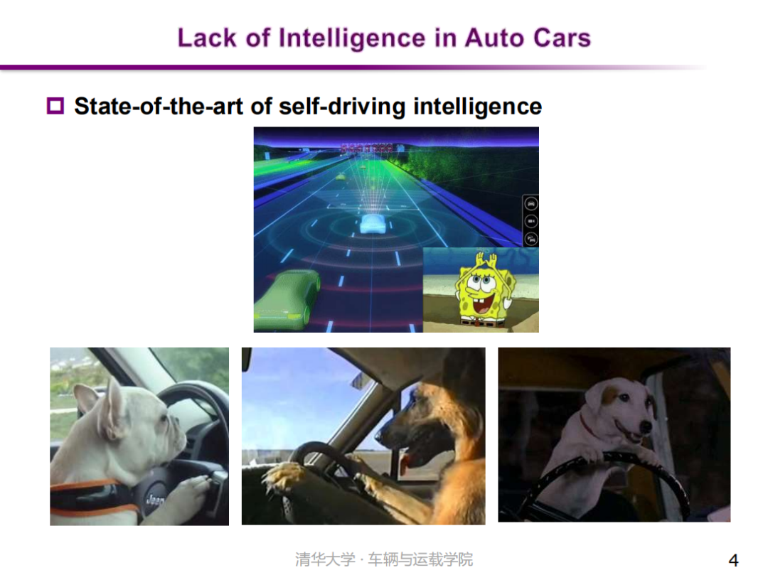 然而当前自动驾驶汽车智能水平还有待进一步提高。一个有趣的例子是很多高级哺乳动物,比如说人类的好朋友“宠物狗”也可以进行一定程度的车辆驾驶。这些都是真实的“宠物狗”开车视频,可以看出,聪明的动物们是可以做到车道保持、弯道转向等功能的。因此,如果以驾驶过程的自主性和适用性作为衡量指标,现有自动驾驶系统的水平可能还不及宠物狗的应对能力。这几乎是目前大多数自动驾驶智能水平的真实状态。
