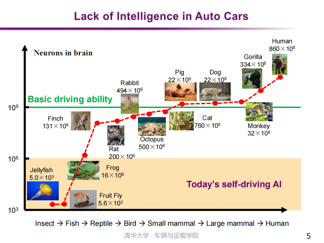 从生物大脑入手观察是一个不错的视角。通常的观点是,生物智能性的高低和其大脑神经元的数量密切相关。若以深度神经网络作为智能性的承载体,一个智能体(Agent)的智能性和人工神经网络的规模也有直接关系。目前,用于自动驾驶汽车的神经网络规模大概达到了百万或千万级别,但这仍然远远低于典型哺乳动物的神经元数量。更不要说,单个机器神经元的能力远远低于人类神经元的能力。所以,现有的自动驾驶技术远没有达到人类的驾驶智能,仅适用于简单稀疏交通工况,还不能应对城市复杂道路交通场景,并且对未知场景的适应能力也存在一定的不足。