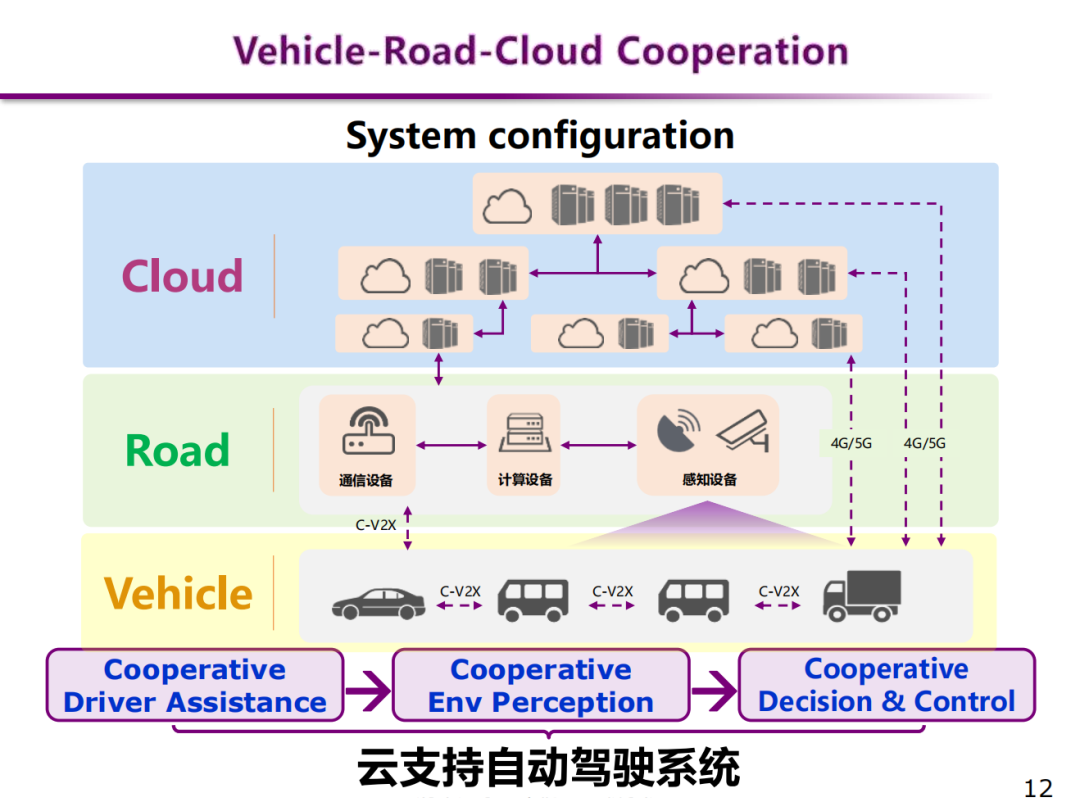 为解决这些挑战性难题,我们依托清华大学车辆与运载学院李克强院士提出的云支持智能网联汽车框架,进行了车路云一体化的自动驾驶策略进化技术路径探索、功能开发和测试验证。该技术路线的基本原理为:通过车端传感器获得车辆状态以及周围环境信息,通过车云或车路云通信技术将所需的数据上传至云端平台,利用云端平台实现自动驾驶策略的快速迭代训练,训练成熟之后的自动驾驶策略将下载到车端进行测试和应用。循环往复这一过程,达到闭环迭代,不断更新的能力。依托这一车路云闭环训练框架,逐渐提升自动驾驶系统的感知、决策和控制性能,从协同式驾驶辅助过渡到协同式环境感知,进一步到协同式决策与控制,最终实现适用于城市道路场景的高级别自动驾驶功能。