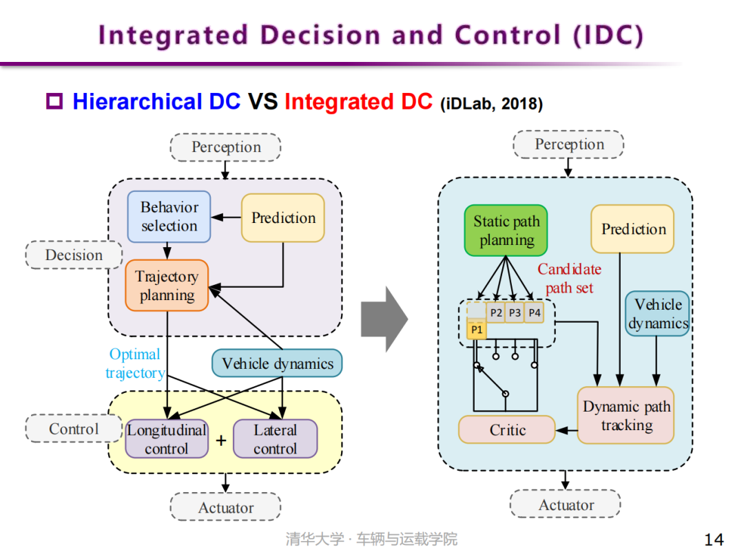 为此,智能驾驶课题组(iDLab)从2018年开始,提出并推动使用一类全新的决策与控制架构,称之为集成式决控架构(IDC,Integrated Decision and Control)。与分层式架构不同,该架构将决策和控制问题整合为一个统一的约束型最优控制问题,仅包含一个性能指标,一个动力学系统,通过强化学习求解一个自动驾驶策略。该架构包含静态路径规划和动态优选跟踪两个模块。静态路径规划仅根据静态道路环境信息(如道路几何结构、路侧指示标识、地面指示标识等,但是不包括红绿灯、交通参与者等信息),给出一套可跟踪的参考路径集合(注意这是一个参考路径的集合,而不是单条最优的参考轨迹)。而动态优选跟踪则构造为一个跟踪参考路径集合的约束型最优跟踪问题,利用强化学习求解该问题,它的值函数(Value function)具有评价不同参考路径性能的能力,实现“自主决策”的功能;它的策略函数(Policy)则输出油门、刹车、方向盘等控制量,具备“运动控制”的功能。