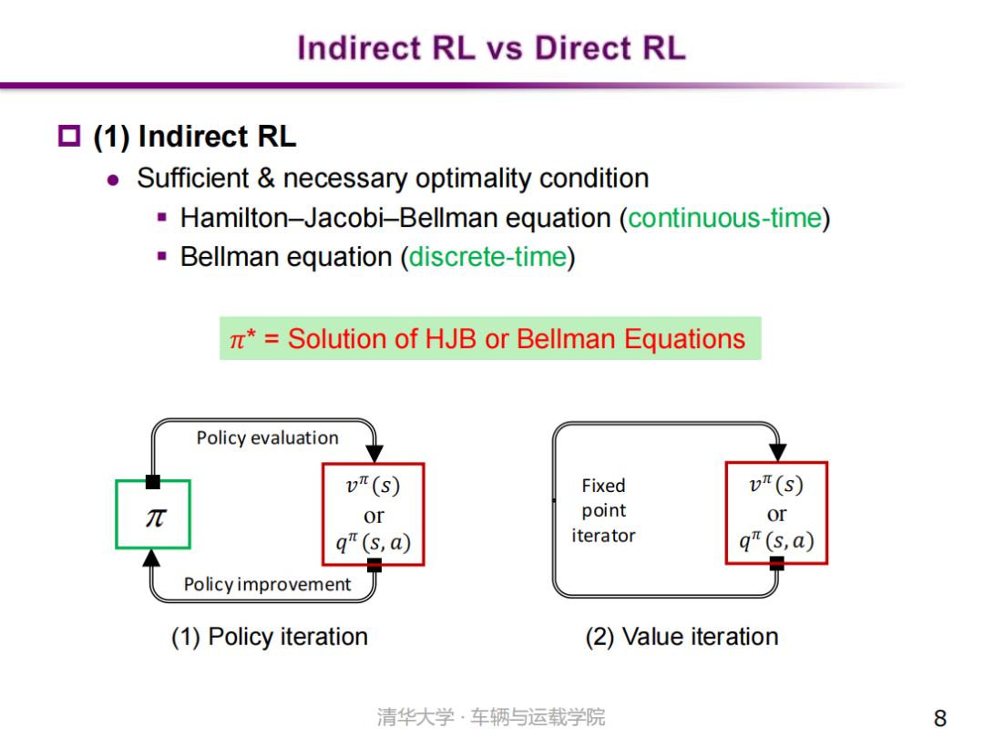 同时,按照最优策略的获得方式,又将强化学习分为间接式强化学习(Indirect RL)和直接式强化学习(Direct RL)两大类别。间接式强化学习(Indirect RL)的基本原理是通过求解问题的最优性条件得到最优策略。针对连续时间问题,一般采用哈密顿-雅可比-贝尔曼方程(HJB equation)进行求解;针对离散时间问题,则采用贝尔曼方程(Bellman equation)进行求解。