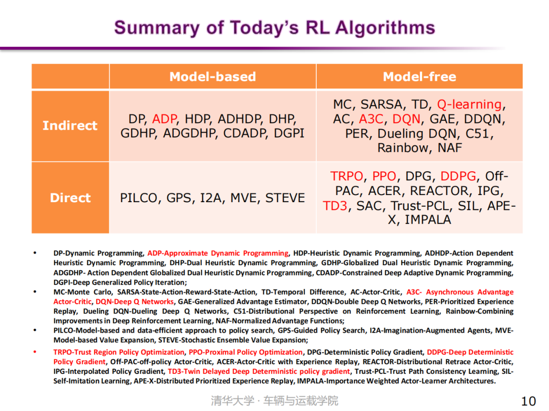 按照上述两种分类方法,一是有无环境模型,二是问题求解方式,我们可以把现有的主流强化学习算法进行更加清晰的分类和定位。如ADP、Q-learning、A3C、DQN、TRPO、PPO、DDPG、TD3、DSAC等,均可依据这一分类方法找到所属的位置。值得注意的是,Actor-Critic是强化学习的一个典型架构,实际上它既可以从间接法推导得到,也可以从直接法推导得到。从间接法的观点看,Critic是一步策略评价,Actor是一步策略更新。从直接法的观点看,Actor本身是Policy Gradient的估计过程,而Critic则是该梯度内部的一项,即Value函数的估计。