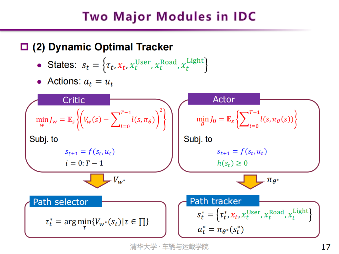为了破解这一难题,我所在课题组以李克强院士提出的云支持智能网联驾驶体系框架为基础,通过所提出的集成式决控(IDC)架构巧妙地融合了强化学习的Actor-Critic求解机制,实现了在线计算效率高、策略求解性能佳的双重保障。所提出的IDC架构包括静态路径规划和动态优选跟踪两个模块。前者依托场景静态信息自适应生成候选路径集;后者结合动态交通信息,构造了一个跟踪候选数据集的约束型最优控制问题,这是强化学习应用至关重要的关键设计。