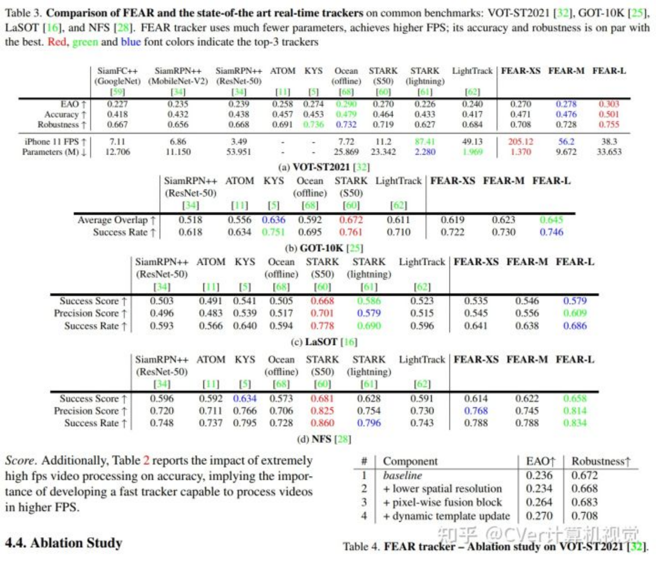 通过使用新颖的模块插入复杂的主干,FEAR-M 和 FEAR-L 跟踪器在几个学术基准上的准确性和效率都超过了大多数 Siamesetracker。
