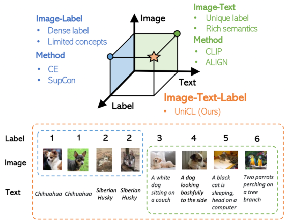 CVPR 2022微软发表的这篇工作,希望同时利用图像、文本、label三者的信息,构建一个统一的对比学习框架,同时利用两种训练模式的优势。下图反映了两种训练模式的差异,Image-Label以离散label为目标,将相同概念的图像视为一组,完全忽视文本信息;而Image-Text以图文对匹配为目标,每一对图文可以视作一个单独的label,文本侧引入丰富的语义信息。