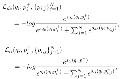 给定查询中的查询 q 和候选段落列表P={Pq,i},将每个 q, p 对输入查询和段落编码器,并输出token表示。基于最终表示,用度量交互(即,如在双编码器中)和后期交互(即,如在 ColBERT 中)计算两个相关性分数Sde和Sli。将候选段落的分数概率分布公式化如下: