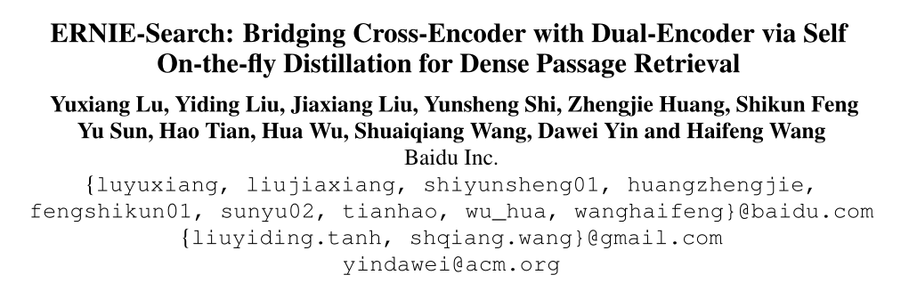 本文描述了一种用于开放域 QA 的密集段落检索的新训练方法,即 ERNIE-Search。ERNIE-Search 的核心思想是自动态蒸馏,通过共享编码器和不同的交互方案共同训练教师和学生。