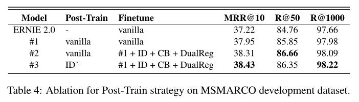作者通过替换 Post-Train 策略中的优化形式来分析检索器的结果。上表显示了消融结果。此表中的所有实验都是没有级联蒸馏阶段的训练。