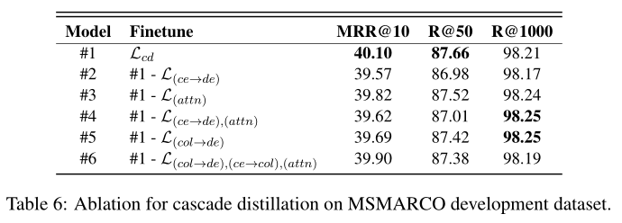 上表显示了检索器对级联蒸馏的所有消融实验结果。我们可以看到,联合使用所有损失可以获得最佳性能。当消除这些损失中的一个或多个时,检索器的性能较差,这表明级联蒸馏从所有损失中受益。