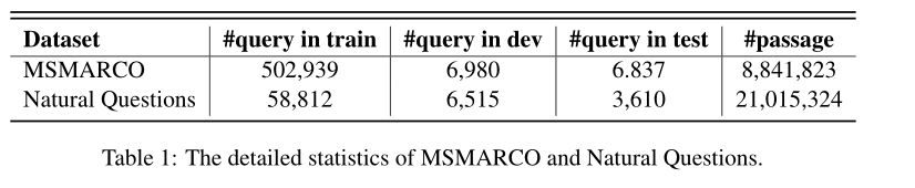 作者对两个流行的开放域 QA 基准进行了实验:MSMARCO Passage Ranking (MSMARCO)和 Natural Questions (NQ)。数据集的详细统计数据见上表。