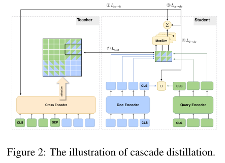 它允许对批量负样本进行蒸馏,这对于训练双编码器至关重要。此外,也有少数研究采用了多教师蒸馏,即同时使用交叉编码器和 ColBERT 作为教师。值得注意的是,所有这些研究都验证了使用这种跨架构蒸馏设置改进双编码器是卓有成效的,其中教师比双编码器学生配备了更具表现力的查询-段落交互。