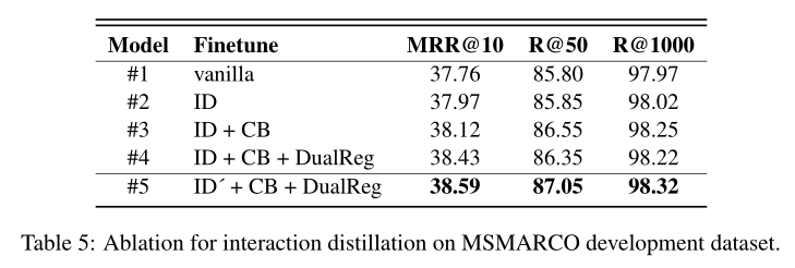 上图说明了交互蒸馏。作者使用两种不同的交互方案优化相同的编码器,其中简单的度量交互是从更复杂的交互中提炼出来的。在训练过程中,交互蒸馏有效地弥合了不同交互之间的差距,并最终确定了一个可用于提取更复杂交互的模型。此外,它是有效的,因为它只需要一个feed-forward步骤即可产生教师和学生的分数。