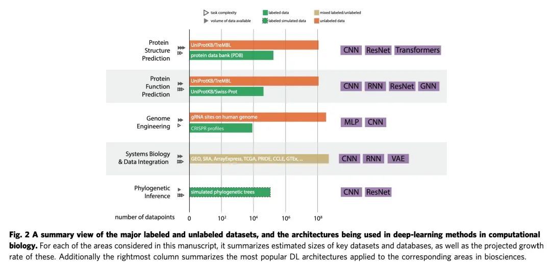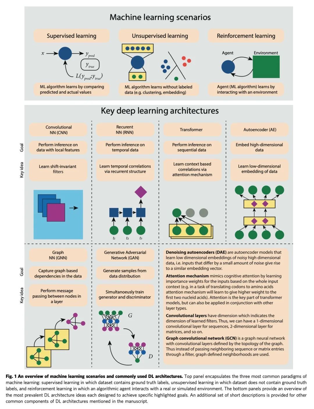 生物科学领域应用深度学习的进展和开放挑战。最近AlphaFold2在从蛋白质序列预测其3D结构方面的成功,突出了迄今为止深度学习在计算生物学中的最有效应用之一。深度学习(DL)允许使用由几层非线性计算单元组成的复杂模型,找到具有多层抽象的数据表示。通过深度学习在各种应用领域的成功观察,使用深度学习的功效取决于专门的神经网络架构的发展,这些架构可以捕获数据的重要属性,如空间定位(卷积神经网络-CNN)、顺序性(循环神经网络-RNN)、上下文依赖(Transformers)和数据分布(autoencoders-AE)。本文讨论了深度学习在五个广泛领域的最新进展、局限性和未来前景:蛋白质结构预测、蛋白质功能预测、基因组工程、系统生物学和数据整合以及系统发育推理。讨论了每个应用领域,涵盖了深度学习方法的主要瓶颈,如训练数据、问题范围、以及在新环境下利用现有深度学习架构的能力。最后,对生物科学领域的深度学习的特定主题和一般挑战进行了总结。
