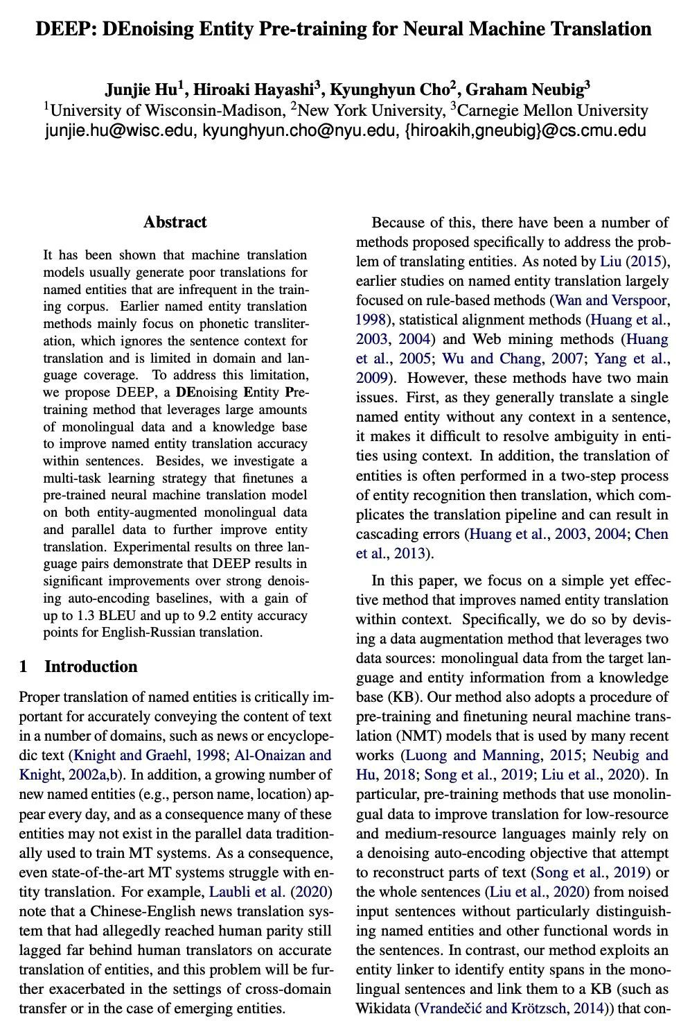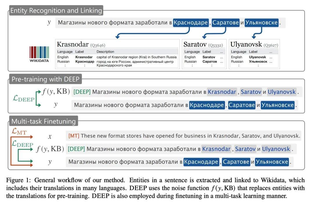 DEEP:面向神经机器翻译的去噪实体预训练。已有研究表明,机器翻译模型通常对训练语料库中不常见的命名实体产生较差的翻译。早期的命名实体翻译方法主要集中在音译上,忽略了翻译的句子上下文,而且在领域和语言覆盖上有局限性。为解决这一局限性,本文提出DEEP,一种去噪实体预训练方法,利用大量的单语数据和知识库来提高句子内命名实体翻译的准确性。此外,本文研究了一种多任务学习策略,在实体增强的单语数据和平行数据上微调预训练神经机器翻译模型,以进一步提高实体翻译。在三种语言对上的实验结果表明,DEEP的结果比强去噪自动编码基线有了明显改善,在英语-俄语翻译中获得了高达1.3的BLEU和高达9.2的实体精度的增益。