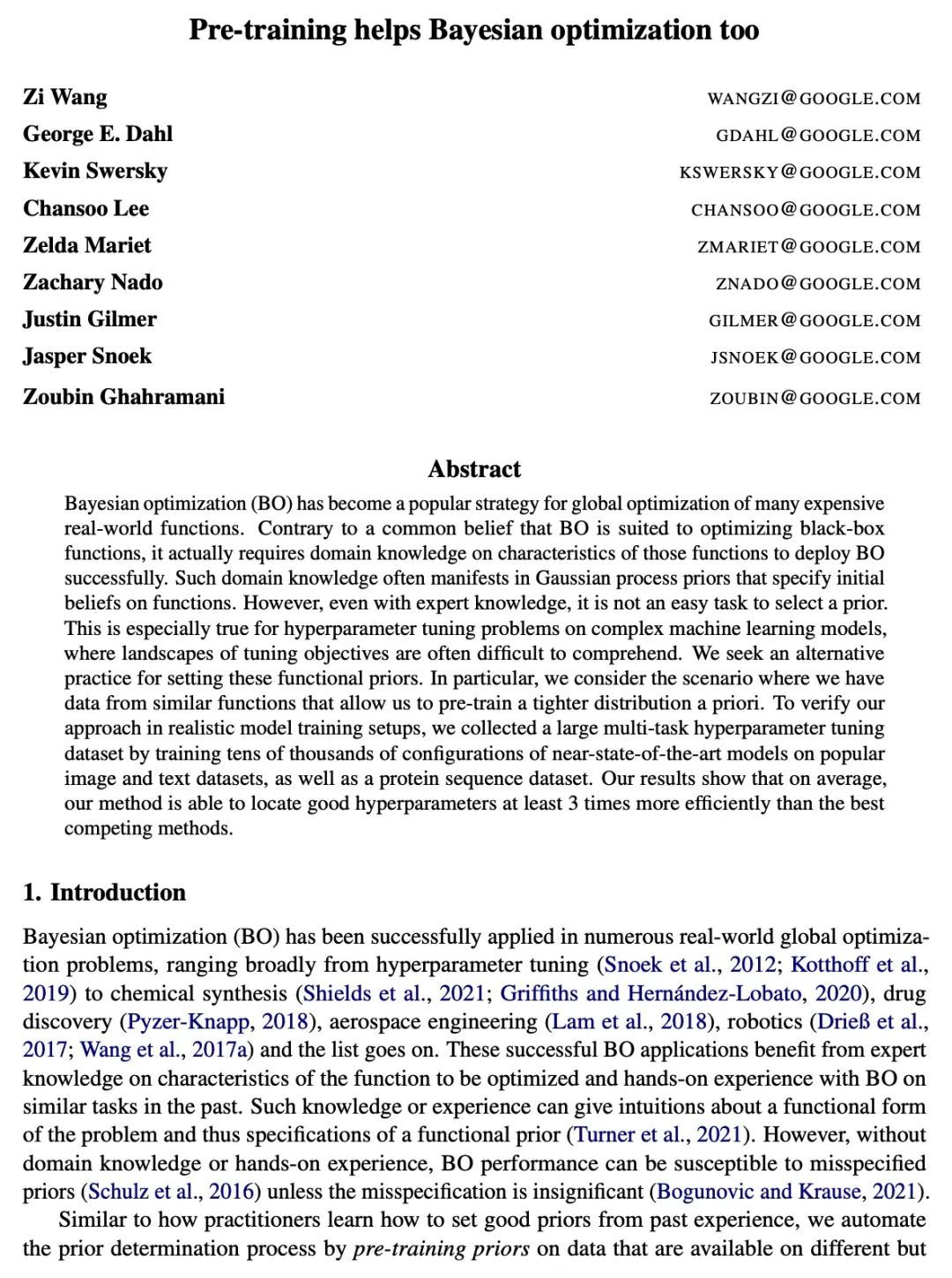 预训练也有助于贝叶斯优化。贝叶斯优化(BO)已经成为许多昂贵现实世界函数全局优化的流行策略。与人们普遍认为BO适合优化黑箱函数相反,实际上需要关于这些函数特征的领域知识才能成功部署BO。这种领域知识通常表现为高斯过程先验,指定了对函数的初始置信。然而,即使有专家知识,选择一个先验也不是一件容易的事。这对于复杂的机器学习模型的超参数调优问题来说尤其如此,调优目标的地貌往往难以理解。本文寻求一种替代性的做法来设置这些函数先验。所考虑的情况是,有类似函数的数据,允许预训练一个更严格的分布。为了在现实的模型训练设置中验证所提出的方法,本文收集了一个大型的多任务超参数调调优据集,在流行的图像和文本数据集以及蛋白质序列数据集上训练了几万个接近最先进的模型配置。实验结果表明,平均而言,所提出方法能比最好的竞争方法至少更有效3倍地找到好的超参数。