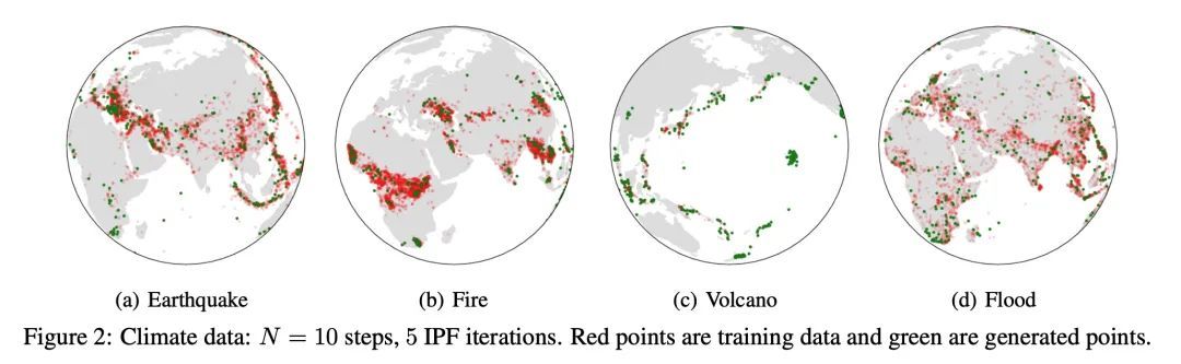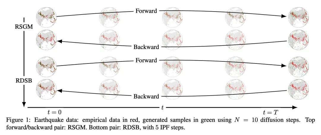 黎曼扩散薛定谔桥。基于得分的生成模型在密度估计和生成建模任务上表现出最先进的性能。这些模型通常假设数据的几何形状是平坦的,然而最近的扩展已经被开发出来,以合成黎曼流形上的数据。现有的加速扩散模型采样的方法通常不适用于黎曼设置,基于黎曼分数的方法还没有自适应到数据集插值的重要任务。为了克服这些问题,本文提出黎曼扩散薛定谔桥(Riemannian Diffusion Schrödinger Bridge)。将扩散薛定谔桥推广到非欧几里得环境,并将基于黎曼分数的模型扩展到第一次逆转之后。在合成数据和真实的地球和气候数据上验证了所提出的方法。