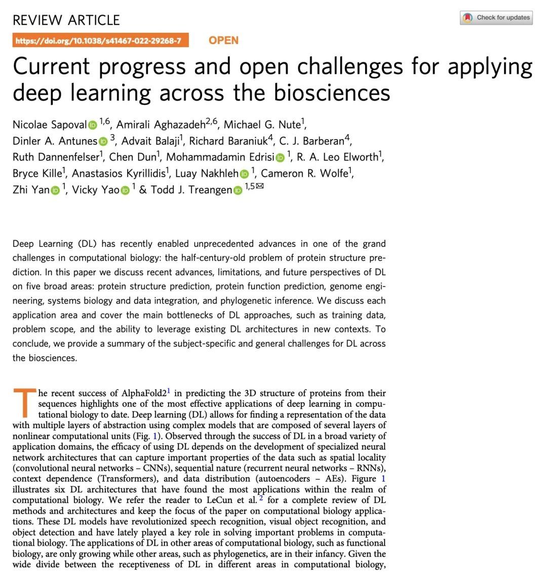 1、[LG] Current progress and open challenges for applying deep learning across the biosciences