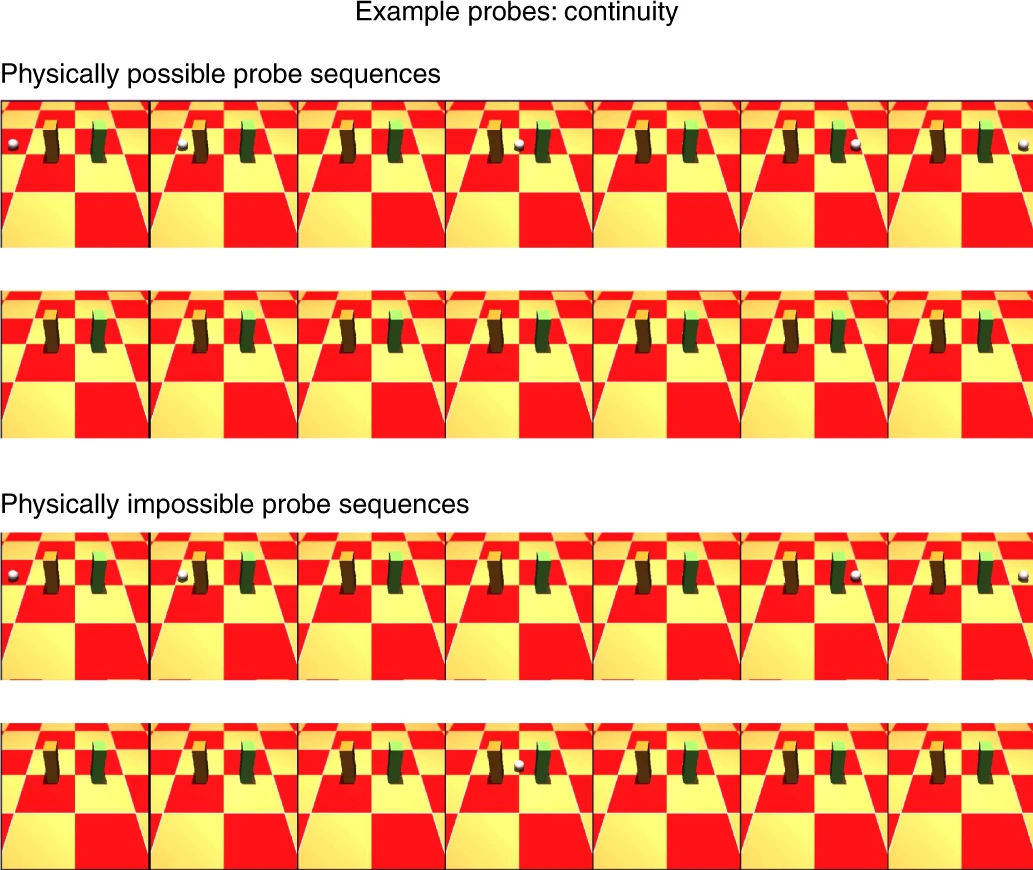 另一方面,发展心理学认为一个物理概念对应于一组未来如何展开的期望。例如人们期望物体不会神奇地从一个地方突然传送到另一个地方,而是通过时间和空间追踪连续的路径,这就有了连续性的概念。因此,有一种测量特定物理概念知识的方法:违反期望 (VoE) 范式。
