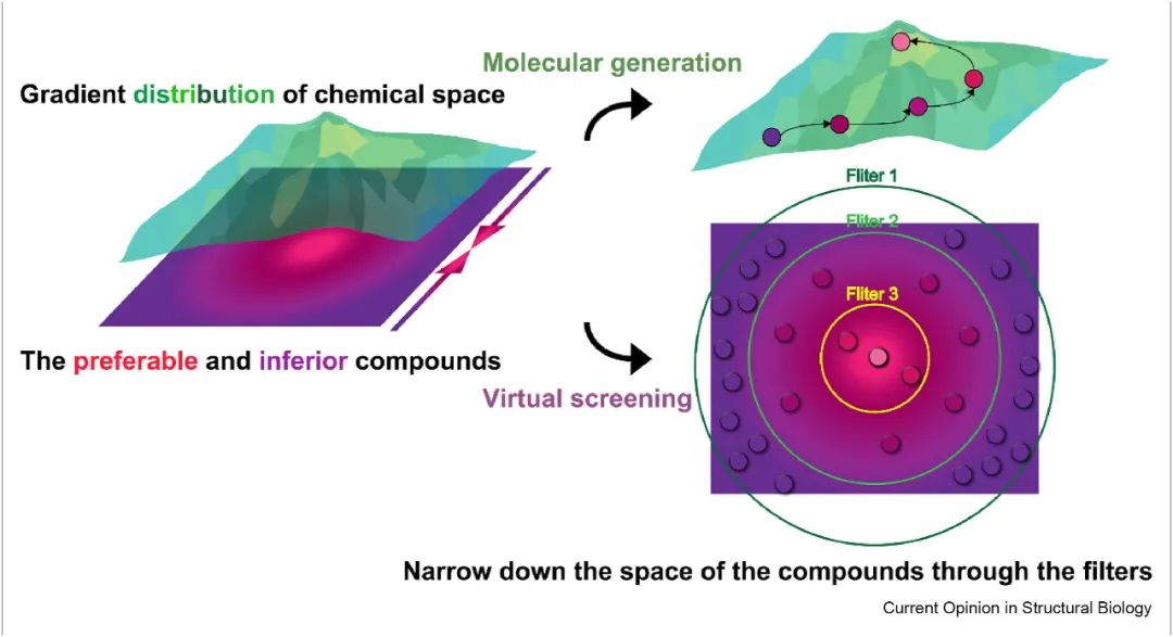 图1 通过虚拟筛选和分子生成来探索化学空间的过程。虚拟筛选通过给定的化学库的性质来筛选化合物,而新药设计通过聚焦于定向性质来生成新的化合物。
