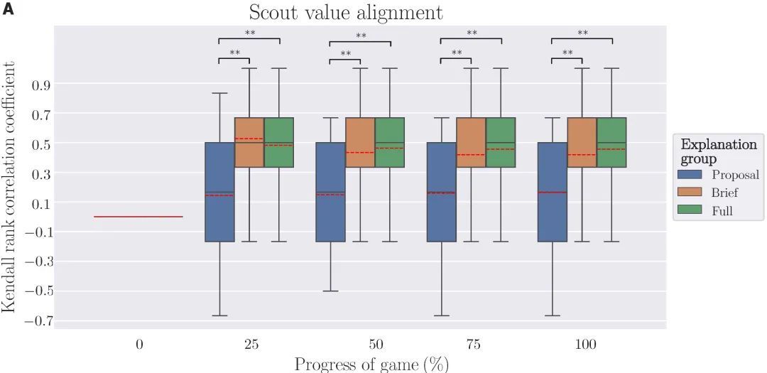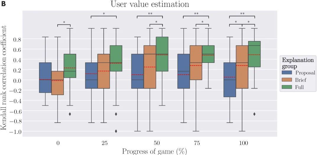 本文提出的XAI系统成功地证明了双向人机价值对齐框架的可行性。从倾听者的角度来看,所有三个解释组中的机器人都可以在游戏进度达到25%时,通过对至少60%的目标重要性进行正确排序,快速与用户的价值进行对齐。从表达者的角度来看,通过提供适当的解释,机器人可以向用户说明其意图,并帮助人类更好的感知机器人的价值,当给机器提供”完整解释“时,只需在游戏进度达到50%时即可实现人类用户价值与机器人价值的统一,而当只提供”简要解释“时,游戏进度需要达到75%时才能完成价值的统一。