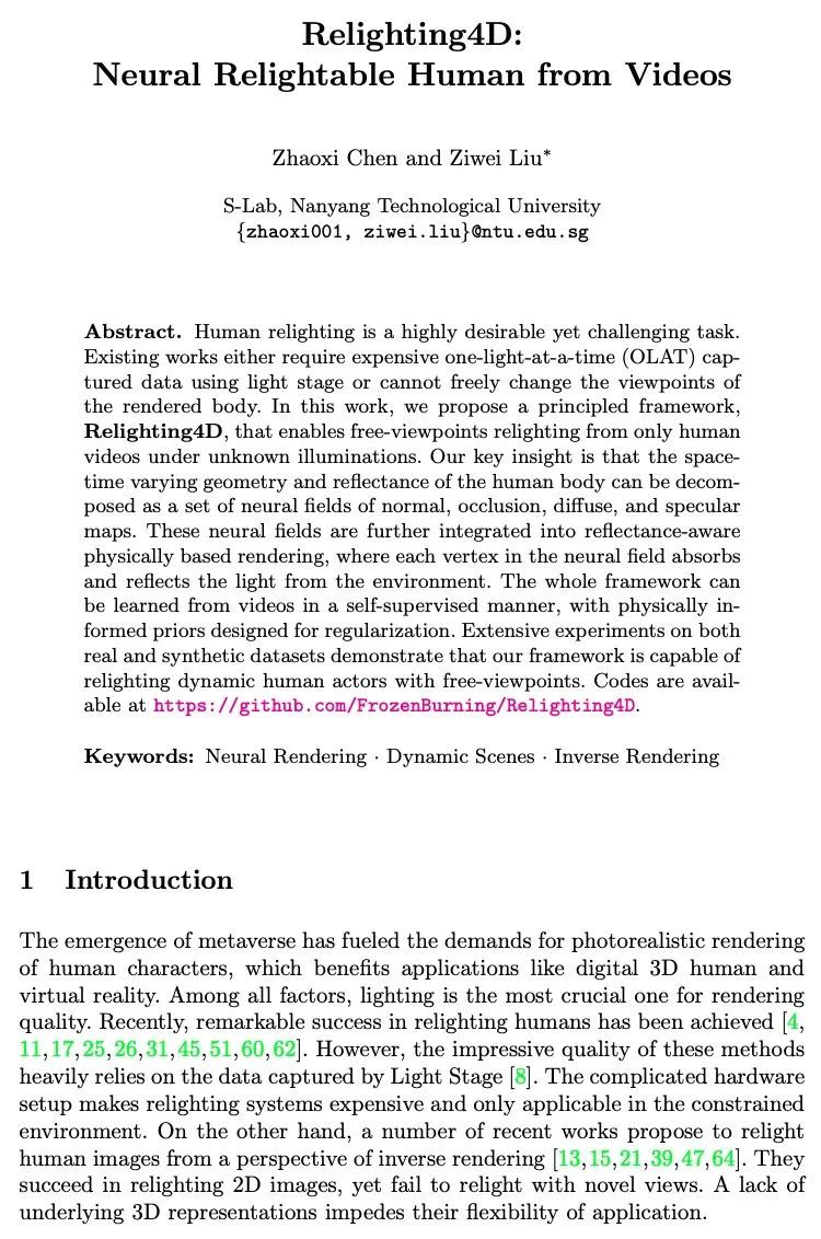 [CV] Relighting4D: Neural Relightable Human from Videos