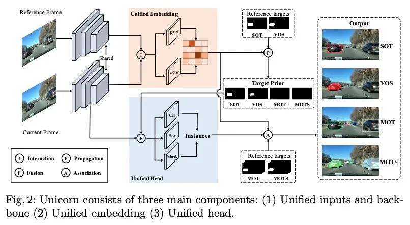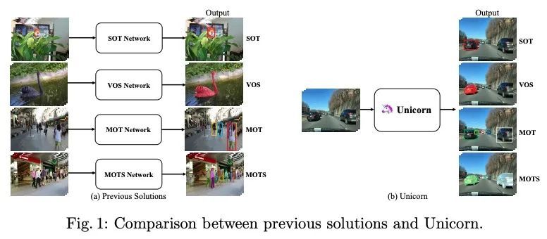 目标跟踪的大一统方法研究。本文提出一种统一方法Unicorn,它可以用一个网络用相同的模型参数同时解决四种跟踪问题(SOT、MOT、VOS、MOTS)。由于目标跟踪问题本身的定义比较零散,大多数现有的跟踪器都是为解决单一或部分任务而开发的,且过度专注于特定任务的特征。相比之下,Unicorn提供了一个统一的解决方案,在所有跟踪任务中采用相同的输入、骨干、嵌入和头。Unicorn首次完成了跟踪网络架构和学习范式的大统一。Unicorn在8个跟踪数据集上的表现与其特定任务的对应方法相当或更好,包括LaSOT、TrackingNet、MOT17、BDD100K、DAVIS16-17、MOTS20和BDD100K MOTS。