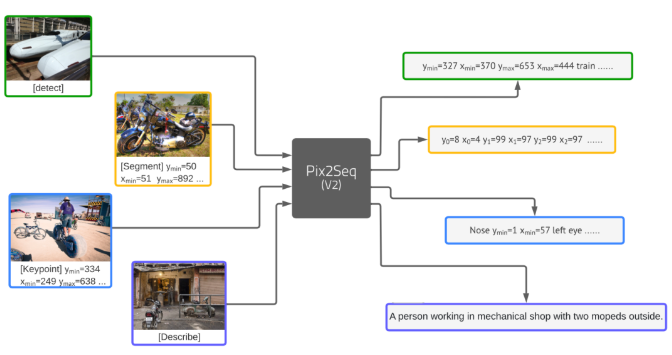 Pix2Seq在这样的动机下诞生了:既然输出形式不同是难点,能否将各类输出形式都统一成token sequence?