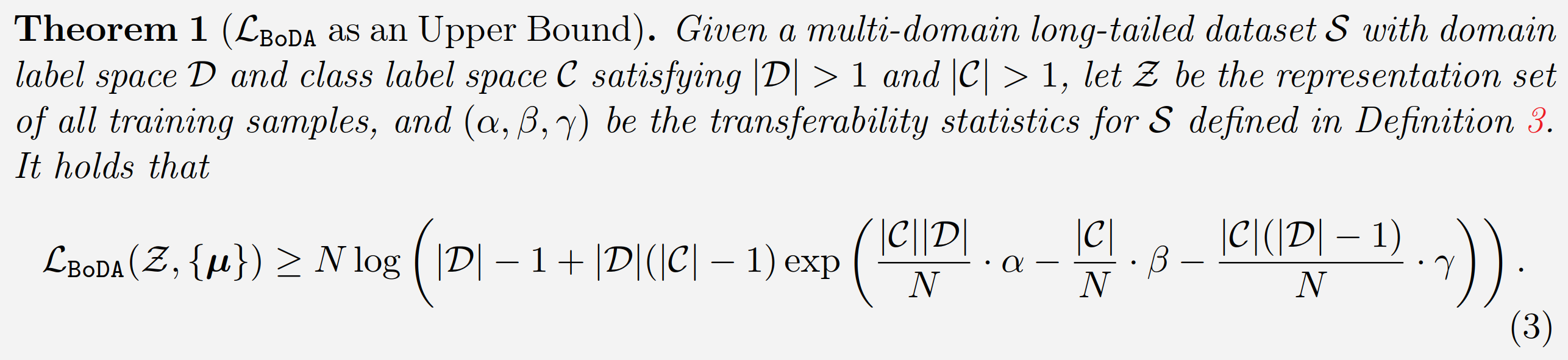 可以发现,BoDA 将原始的距离函数 d 缩放了 1/Ndi,ci 的因子,其中Ndi,ci 是域类对 (di,ci) 的样本数量。即,BoDA 通过引入平衡的距离度量\( \tilde{d} \)来抵消不平衡域类对的影响。而 对于LBoDA ,作者证明了以下定理: