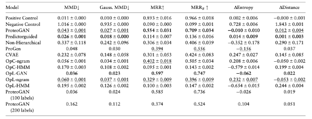 ▲图|使用 MMD、MRR 和多样性指标对 ProteoGAN 和各种对比模型的评估结果(来源:Bioinformatics)