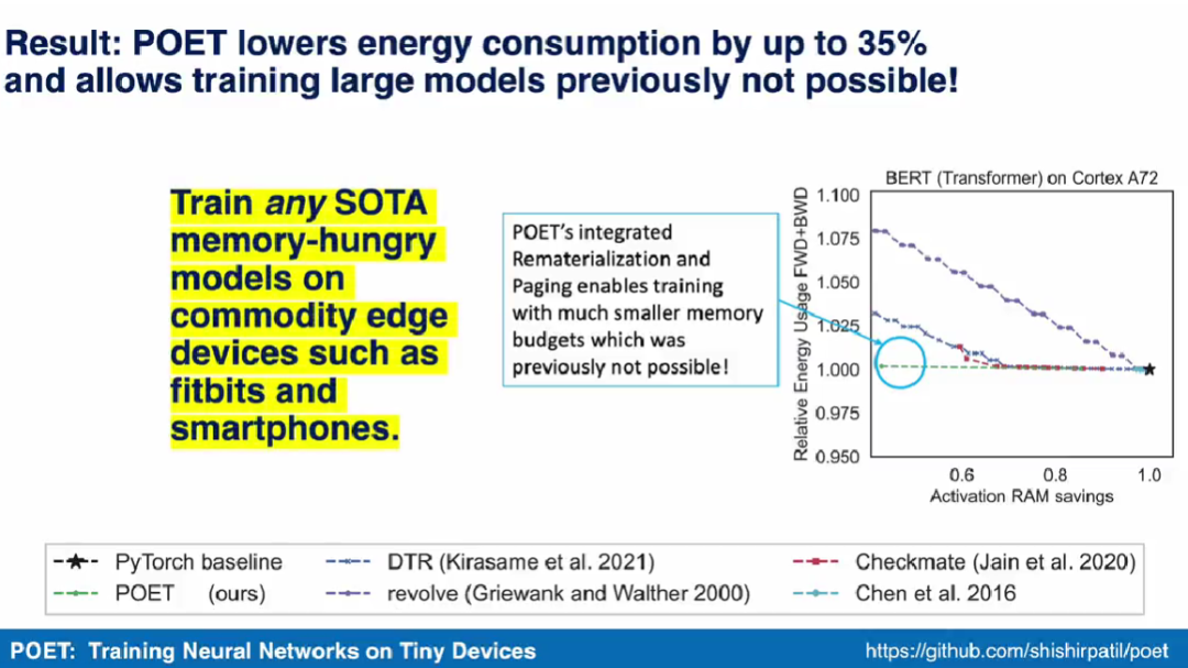 论文一作 Shishir Patil 在演示视频中表示,POET 算法可以在智能手机等商用边缘设备上训练任何需要极大内存的 SOTA 模型。他们也成为了首个展示在智能手机和 ARM Cortex-M 设备上训练 BERT 和 ResNet 等 SOTA 机器学习模型的研究团队。