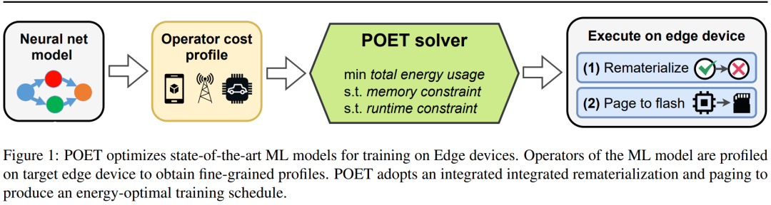 研究者提出了 POET(Private Optimal Energy Training),这是一种在内存受限边缘设备上对现代神经网络进行能量最优训练的算法,其架构如下图 1 所示。鉴于为反向传播缓存所有激活张量的成本极高,POET 对激活进行优化分页和重新实现,因而可以将内存消耗最高减少两倍。他们将边缘训练问题重新表述为整数线性程规划(ILP),发现可以通过求解器在 10 分钟内将其求解到最优。