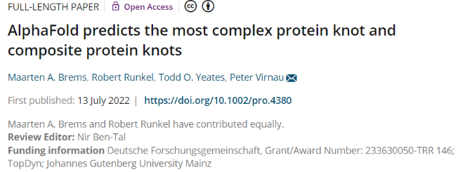 该研究以「AlphaFold predicts the most complex protein knot and composite protein knots」为题,于 2022 年 7 月 13 日发布在《Protein Science》。