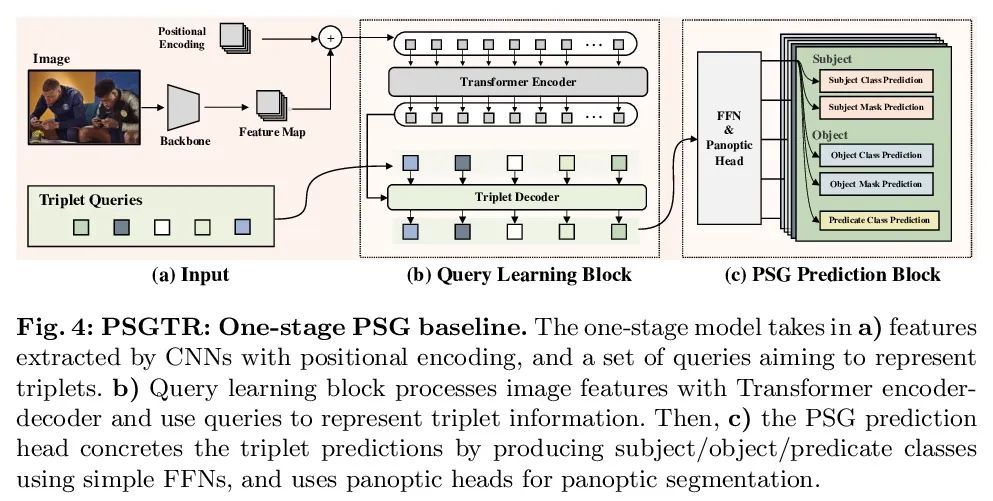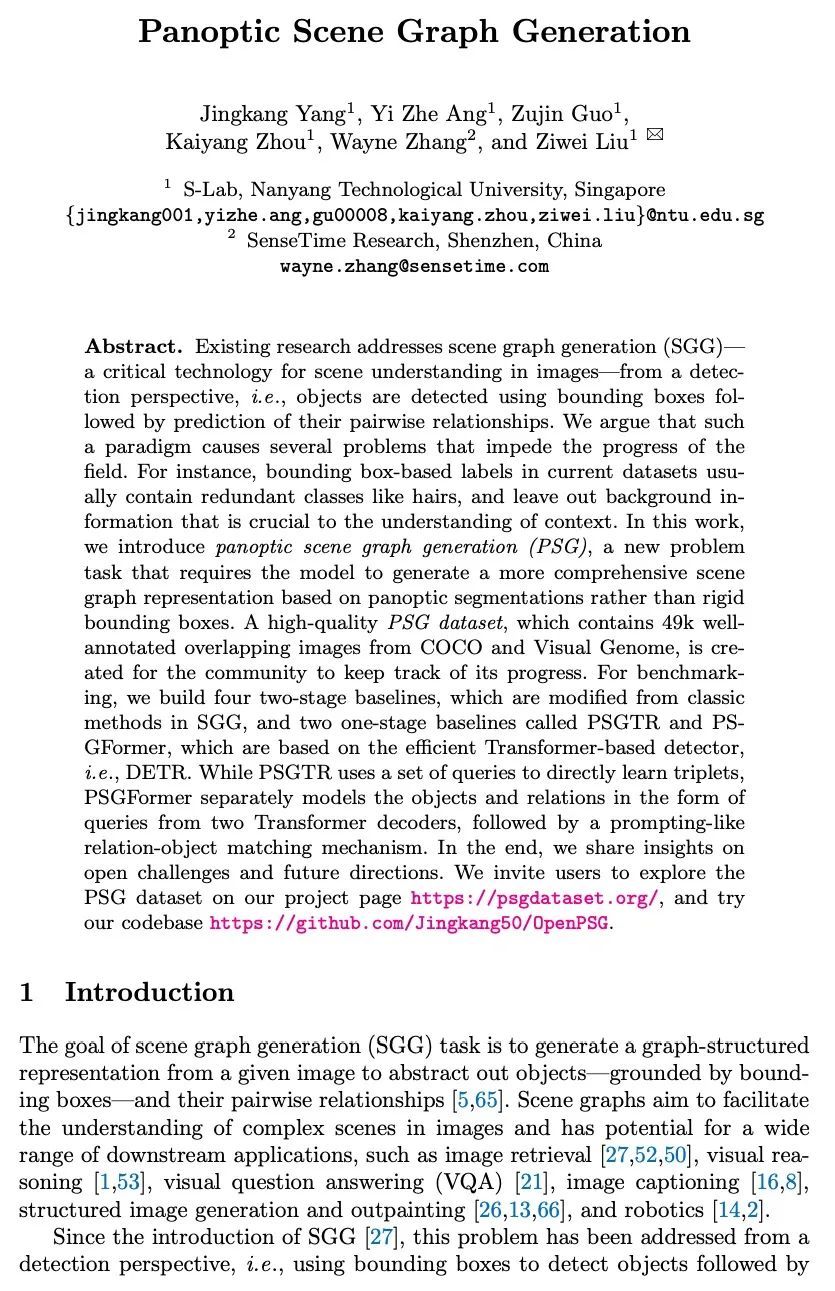 全景场景图生成。现有研究从检测的角度解决场景图生成(SGG)——图像中场景理解的一项关键技术,用边框检测物体,然后预测它们的配对关系。本文认为,这样的范式导致了一些问题,阻碍了该领域的发展。例如,当前数据集中基于边框的标签通常包含像毛发这样的冗余类,并且遗漏了对理解上下文至关重要的背景信息。本文提出全景场景图生成(PSG),一个新的问题任务,要求模型在全景分割的基础上生成一个更全面的场景图表示,而不是刚性的边框。创建了一个高质量的PSG数据集,其中包含来自COCO和Visual Genome的49k个良好标注的交叠图像,供社区跟踪其进展。为进行基准测试,本文建立了四个两阶段基线,这些基线是根据SGG的经典方法修改的,还有两个单阶段基线,称为PSGTR和PSGFormer,基于高效的Transformer检测器,即DETR。PSGTR用一组查询来直接学习三联体,而PSGFormer则以两个Transformer解码器的查询形式分别对对象和关系进行建模,然后采用类似提示的关系-对象匹配机制。