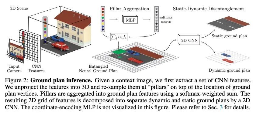 通过自监督静态-动态解缠从单幅图像看到3D物体。人类的感知能可靠地识别3D场景中可移动和不可移动的部分,并通过不完全观察完成物体和背景的3D结构。人不是通过标记的样本来学习这种技能,而是仅通过观察物体的移动来学习。本文提出一种方法,在训练时观察无标签的多视角视频,并学习将复杂场景的单图像观察,如有汽车的街道,映射到3D神经场景表示,该表示被分解为可移动和不可移动的部分,同时合理地完成其3D结构。通过2D神经地平面图分别对可移动和不可移动的场景部分进行参数化。神经地平面是与地平面对齐的特征的2D网格,可被局部解码为3D神经辐射场。该模型通过神经渲染进行自监督训练。实验证明分解的3D表示的固有结构能在街道规模的3D场景中用简单的启发式方法完成各种下游任务,如提取以物体为中心的3D表示、新视图合成、实例分割和3D边框预测,突出了其作为数据高效3D场景理解模型的骨干价值。这种解缠进一步实现了通过对象操作(如删除、插入和刚体运动)进行场景编辑。