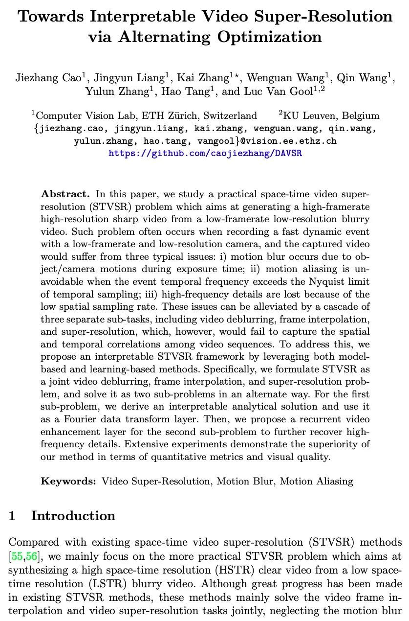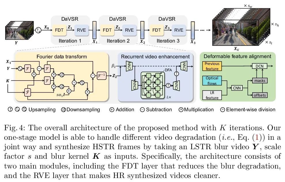 基于交替优化的可解释视频超分辨率。本文研究了一个实用的时空视频超分辨率(STVSR)问题,该问题旨在从低帧率低分辨率模糊视频中生成高帧率高分辨率的视频。当用低帧率和低分辨率摄像机记录快速动态事件时,经常会出现这样的问题,拍摄的视频会出现三种典型的问题:i)由于物体/摄像机在曝光时间内的运动而出现运动模糊;ii)当事件的时间频率超过时间采样的奈奎斯特极限时,运动混叠不可避免;iii)由于空间采样率低,高频细节丢失。这些问题可通过三个独立的子任务级联来缓解,包括视频去模糊、帧插值和超分辨率,然而,这将无法捕捉到视频序列之间的空间和时间相关性。为解决这个问题,本文提出一种可解释的STVSR框架,利用基于模型和学习的方法。将STVSR表述为一个联合的视频去模糊、帧插值和超分辨率问题,并以另一种方式将其作为两个子问题解决。对于第一个子问题,本文推导出一个可解释的分析解决方案,并将其作为一个傅里叶数据转换层。为第二个子问题提出了一种递归视频增强层,以进一步恢复高频细节。大量实验证明了所提出方法在定量指标和视觉质量方面的优越性。