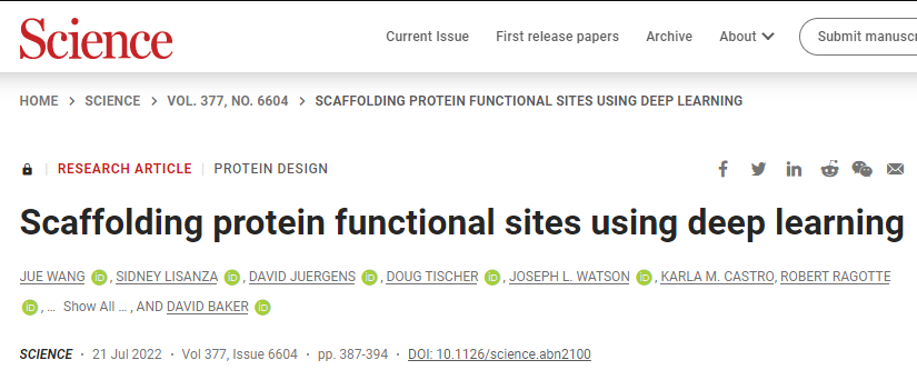 7月22日,论文以“Scaffolding protein functional sites using deep learning”为题发表在Science杂志上。