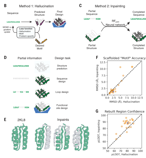 第二种被称为“ Inpainting”(修复,蛋白质修复):即将特定的序列/活性位点输入到软件(RoseTTAFold神经网络)中,软件可以在几秒内填补蛋白质结构的缺失部分,类似于使用语言模型补全给定的几个单词,该方法将蛋白质设计简化为信息缺失—恢复问题。