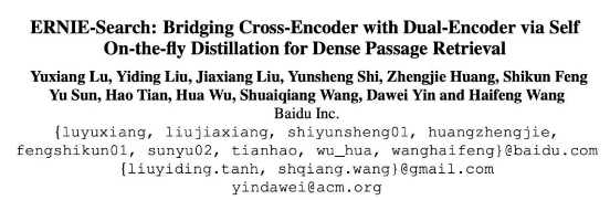 本文提出了两个面向稠密检索模型的蒸馏策略:交互蒸馏 (Interaction Disitllation) 和级联蒸馏 (Cascade Distillation),如果将这两个蒸馏策略结合起来,就得到了该论文标题中提到的名词:动态自蒸馏 (self on-the-fly distillation)。由于是度厂出品,采用该蒸馏策略的训练得到的模型被命名为 ERNIE-Search,ERNIE-Search 在 MARCO 和 NQ 检索数据集上均取得了 SOTA 性能(虽然没出几天就被超越了)。