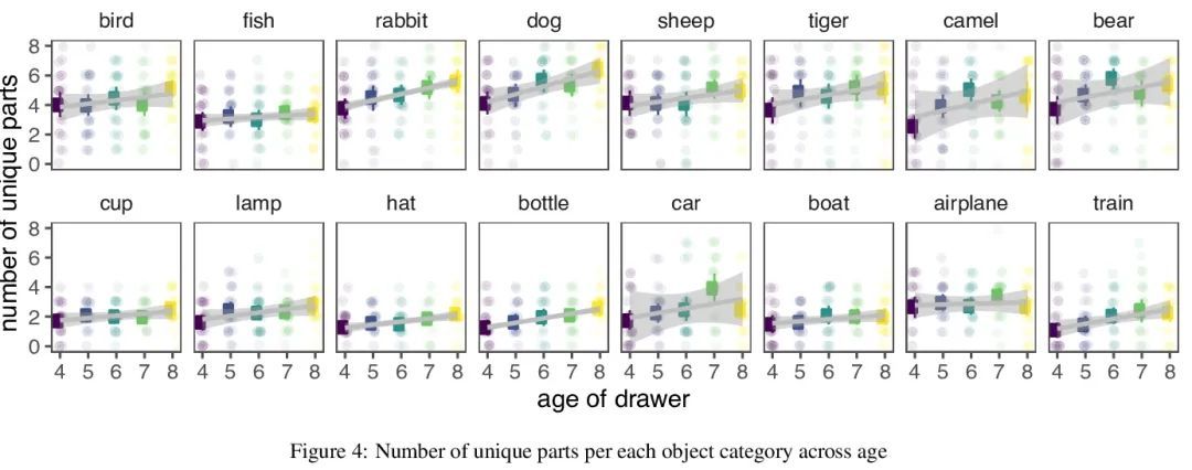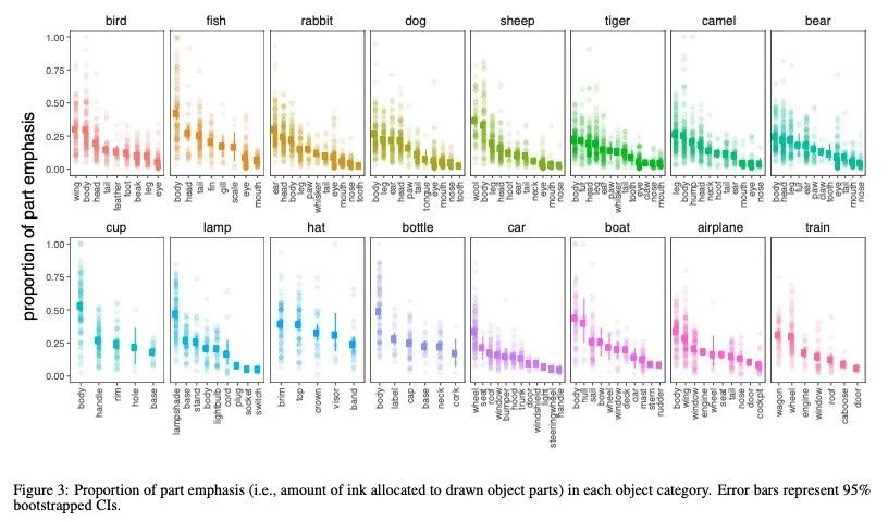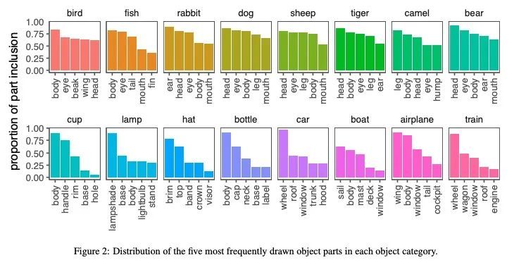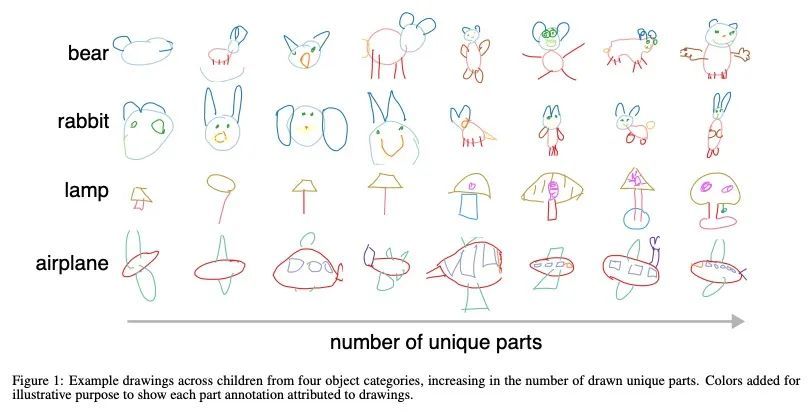 绘制物体语义部件结构的发展性变化。在整个童年时期,儿童对物体概念的绘画越来越容易识别。是什么推动了这种进步?本文探讨了儿童在其绘画中包含这些物体的相关部分的能力的作用。对2160幅由4至8岁儿童绘制的16种常见物体类别的图画中的每个笔触都进行了众包标注。这些部件分解显示了儿童强调的部件数量和种类的巨大差异,以及儿童画的部件数量和他们的画的可识别程度之间的非单调关系。该项研究结果促进了目前对儿童绘画中的部件组成是如何驱动和限制对所描绘物体的识别的理解。