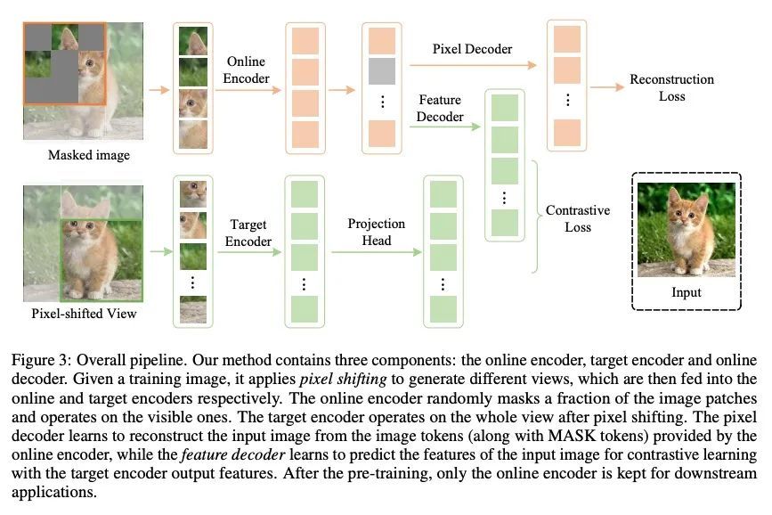对比掩码自编码器是更强的视觉学习器。掩码图像建模(MIM)在各种视觉任务上取得了令人鼓舞的成果。然而,学习到的表示的可辨识性有限,这表明要实现更强大的视觉学习器还有很多工作要做。为了实现这一目标,本文提出对比掩码自编码器(CMAE),一种新的自监督预训练方法,用于学习更全面和更有能力的视觉表示。通过新的设计将对比学习(CL)和掩码图像模型(MIM)详细地统一起来,CMAE利用两者各自的优势,学习具有强大的实例可辨识性和局部可感知性的表示。具体的,CMAE由两个分支组成,其中在线分支是一个不对称的编-解码器,目标分支是一个动量更新编码器。在训练过程中,在线编码器从被掩码图像的潜表示中重建原始图像,以学习整体特征。目标编码器在得到完整图像后,通过与在线编码器的对比学习来提高特征的可辨识性。为了使CL与MIM兼容,CMAE引入了两个新的组件,即用于生成可信的正视图的像素移位和用于补充对比对特征的特征解码器。由于这些新的设计,CMAE有效地提高了表示质量和传输性能,超过了其他MIM的对应方法。CMAE在图像分类、语义分割和目标检测等极具竞争力的基准上实现了最先进的性能。值得注意的是,CMAE-Base在ImageNet上取得了85.3%的top-1准确率,在ADE20k上取得了52.5%的mIoU,分别比之前的最佳结果超出了0.7%和1.8%。