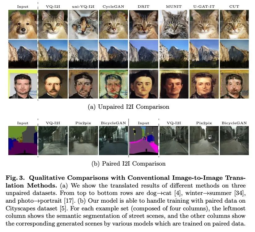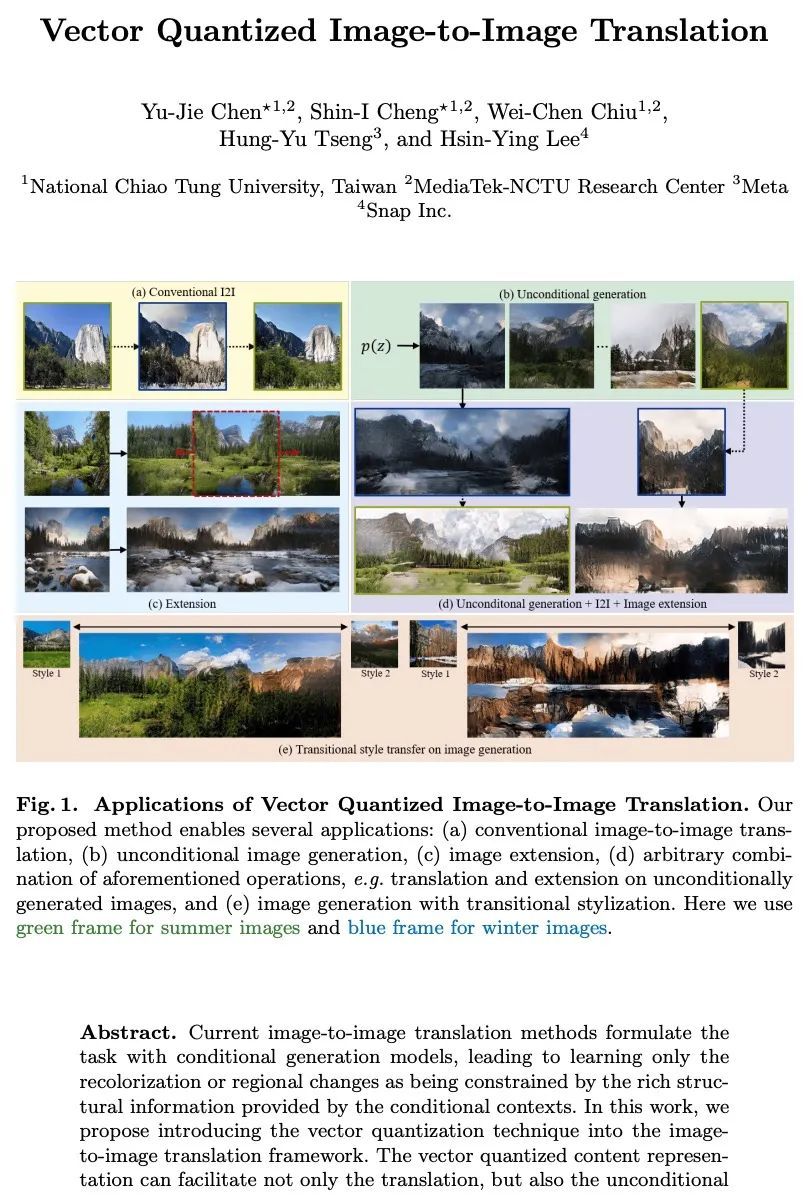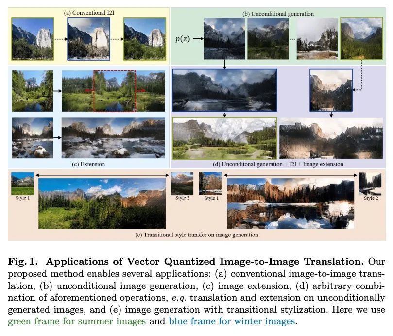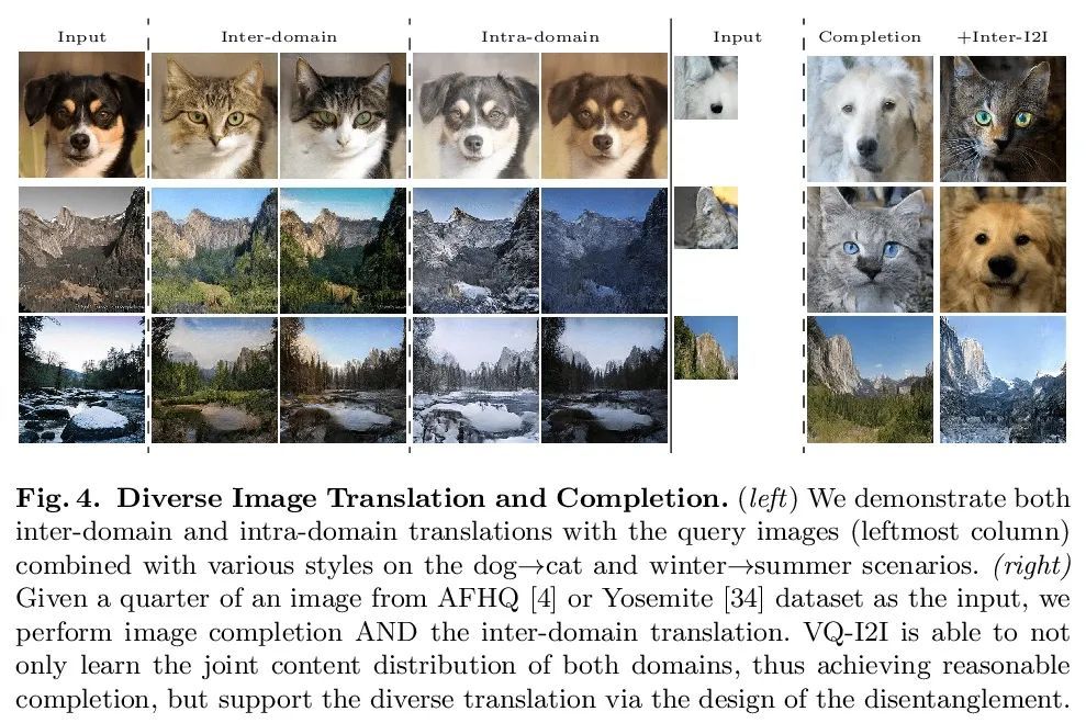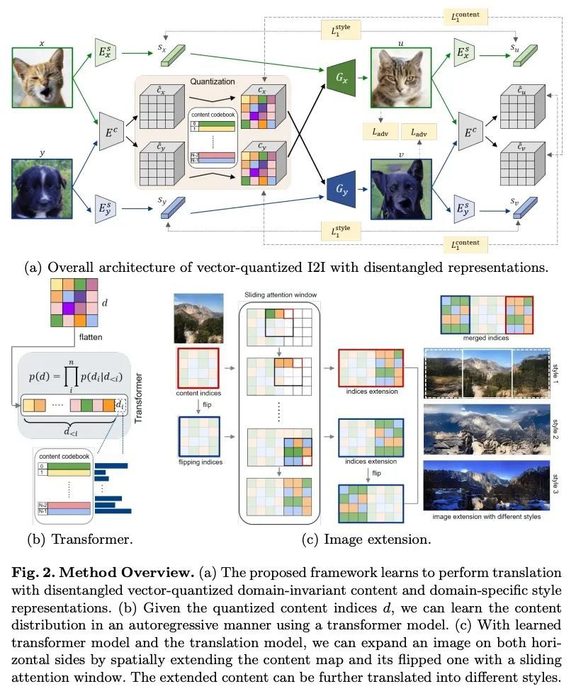 矢量量化图像到图像翻译。目前的图像到图像翻译方法用条件生成模型来制定任务,导致只学习重新着色或区域变化,因为受到条件背景提供的丰富结构信息的限制。本文建议将矢量量化技术引入图像-图像翻译框架。矢量量化的内容表示不仅可以促进翻译,还可以促进不同域之间共享的无条件分布。同时,伴随着拆分后的风格表示,所提出的方法进一步实现了图像扩展的能力,在域内和域间都具有灵活性。定性和定量实验表明,该框架实现了与最先进的图像到图像翻译和图像扩展方法相媲美的性能。与单个任务的方法相比,所提出的方法作为一个统一的框架,将图像到图像的翻译、无条件生成和图像扩展的应用完全释放出来。例如,它为图像生成和扩展提供了风格的可变性,并为图像到图像的翻译提供了进一步的扩展能力。