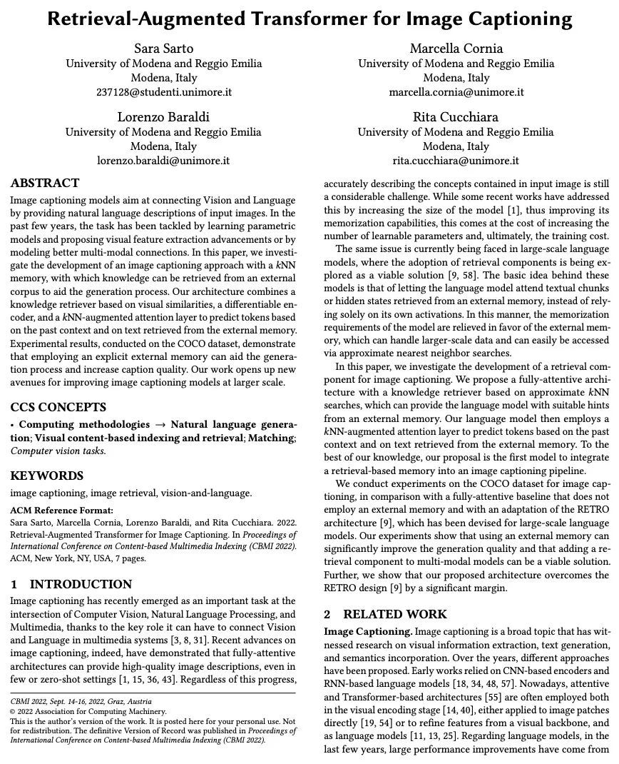 [CV] Retrieval-Augmented Transformer for Image Captioning
