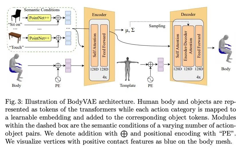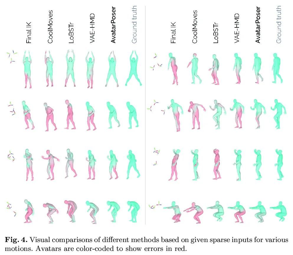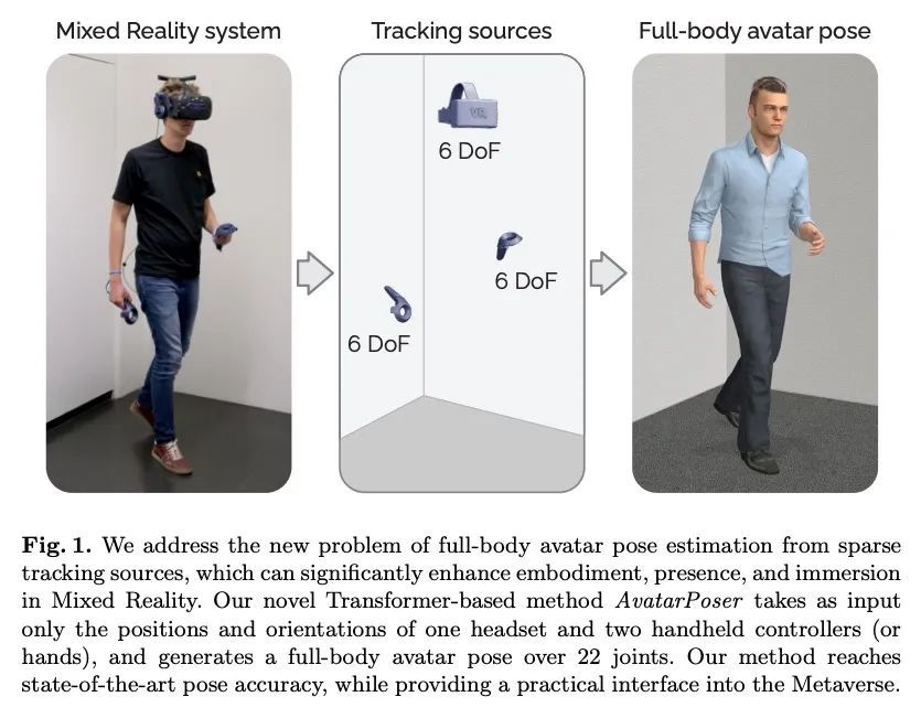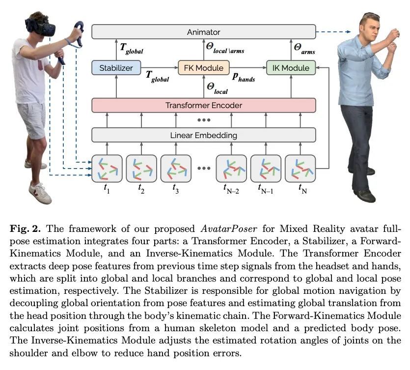 AvatarPoser: 基于稀疏运动感应的铰接全身姿态跟踪。如今的混合现实头戴式显示器追踪用户在世界空间中的头部姿态,以及用户在增强现实和虚拟现实场景中的双手交互。虽然这足以支持用户的输入,但不幸的是,它将用户的虚拟表示仅限制在他们的上半身。因此,目前的系统求助于浮动的化身,其局限性在协作环境中尤为明显。为了从稀疏的输入源中估计全身姿态,之前的工作在骨盆或下半身加入了额外的跟踪器和传感器,这增加了设置的复杂性并限制了在移动环境中的实际应用。本文提出AvatarPoser,第一个基于学习的方法,只用用户的头和手的运动输入就能预测世界坐标中的全身姿态。该方法建立在Transformer编码器基础上,从输入信号中提取深度特征,并将全局运动与学到的局部关节方向解耦,以指导姿态估计。为获得类似运动捕捉动画的准确的全身运动,用反运动学的优化程序来完善手臂关节位置,以匹配原始跟踪输入。评估显示,AvatarPoser在大型运动捕捉数据集(AMASS)的评估中取得了新的最先进的结果。同时,该方法的推理速度支持实时操作,为Metaverse应用提供了一个实用的界面来支持全身的化身控制和表现。
